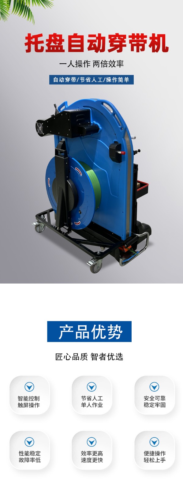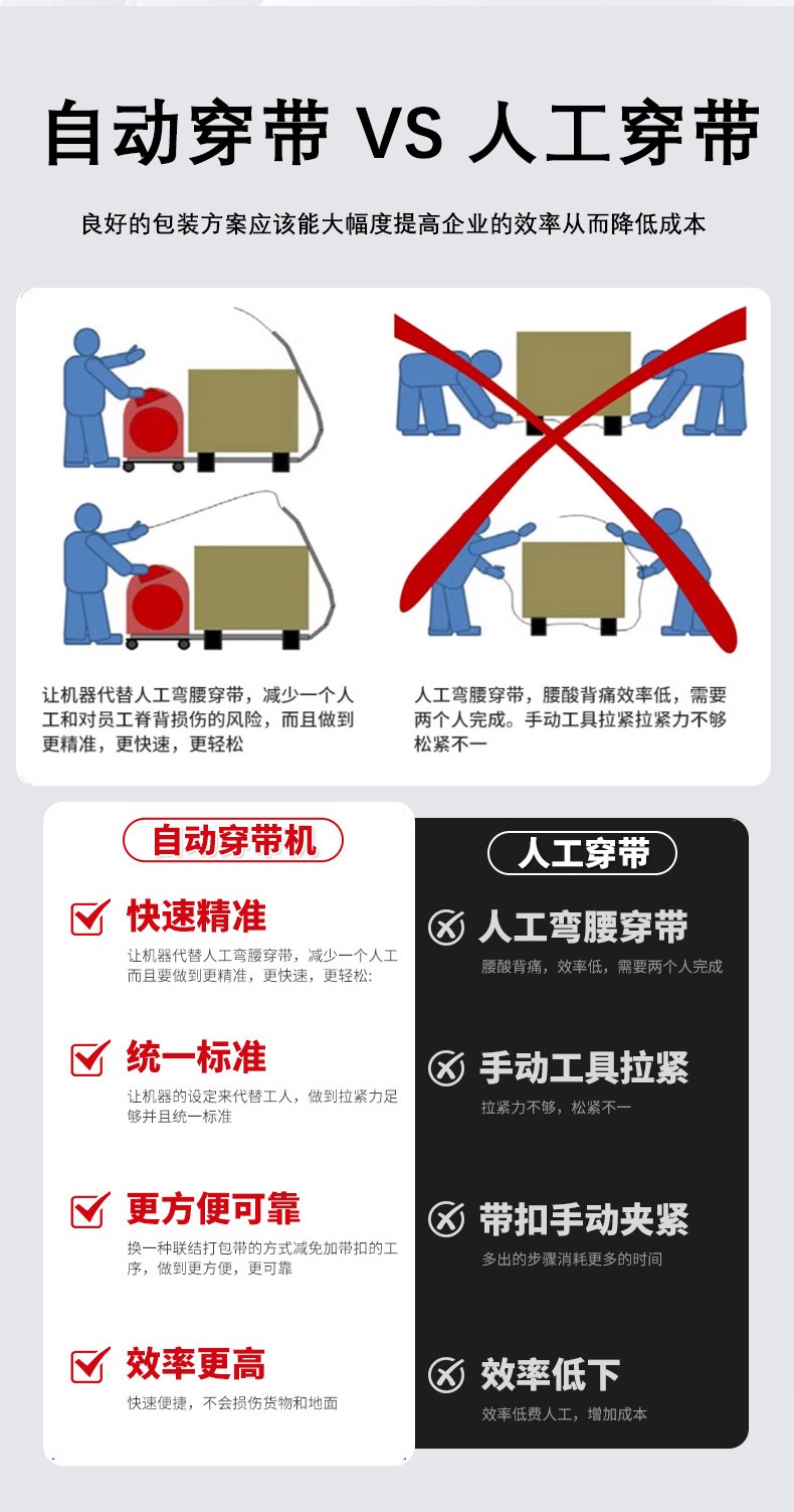 相比人工捆扎(單道耗時 30-60 秒),自動托盤穿帶打包機(jī)的核心優(yōu)勢體現(xiàn)在三個維度: