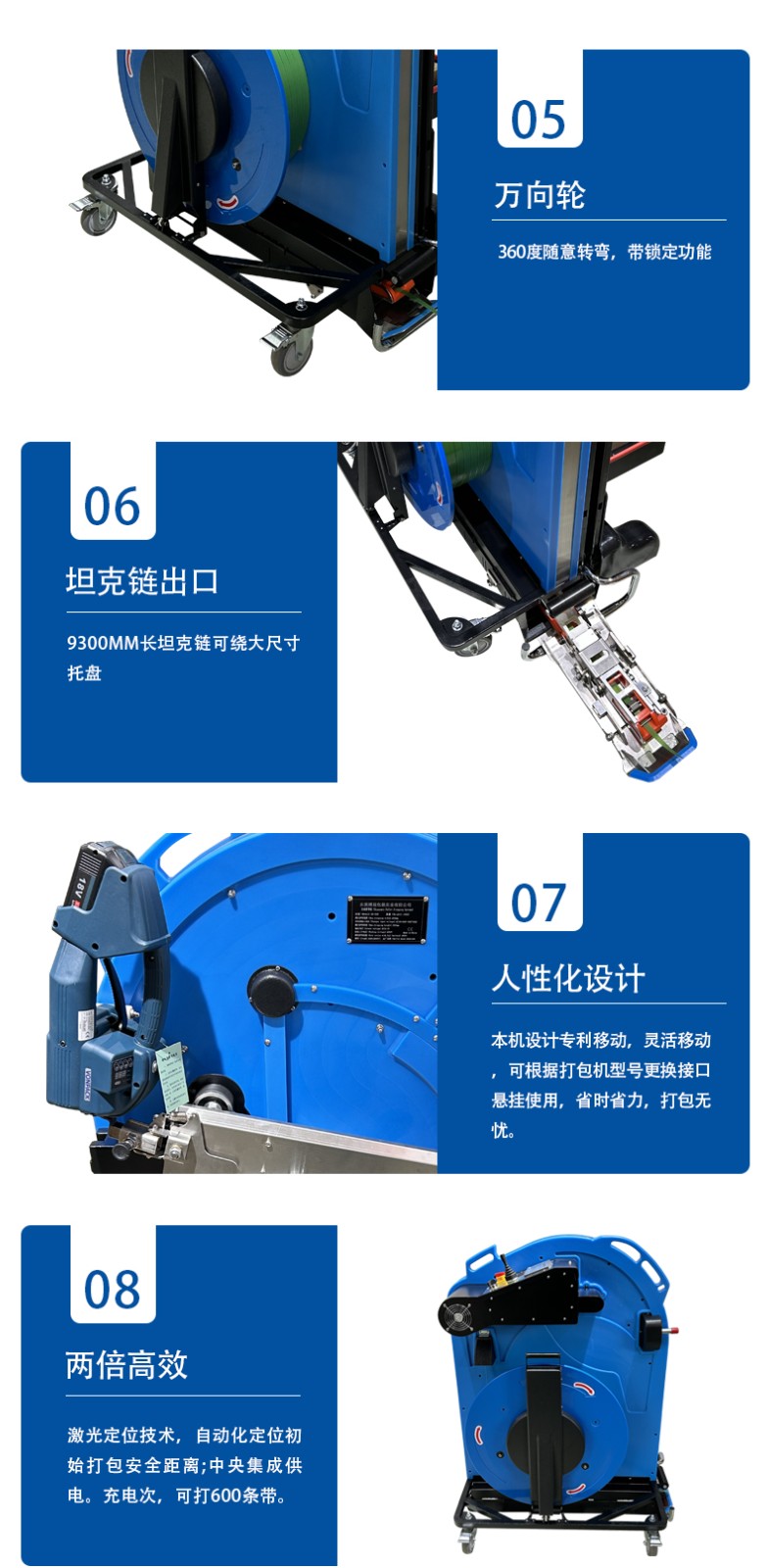 設(shè)備圍繞 “貨物 - 托盤一體化固定” 展開,核心功能覆蓋打包全環(huán)節(jié),無需人工干預(yù)關(guān)鍵動作: